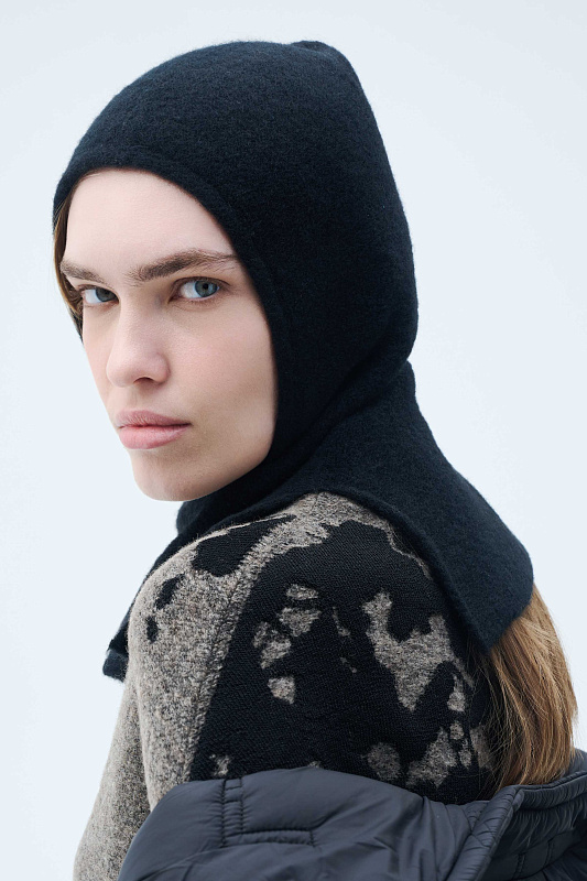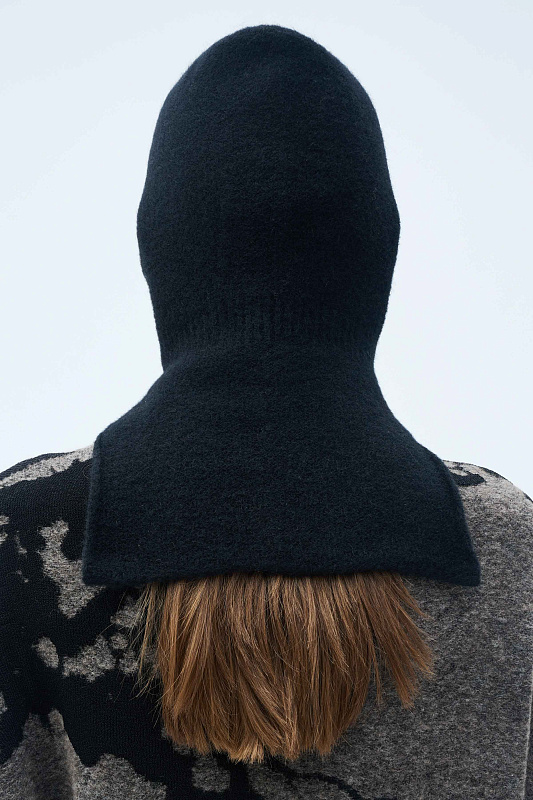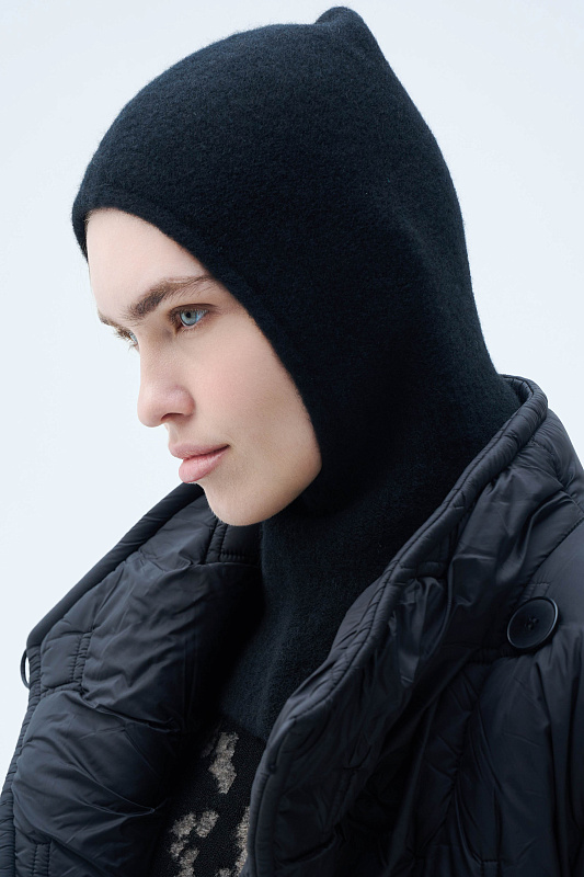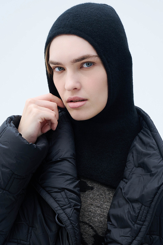 Цельновязаный капор с воротником - манишкой – выполнен из буклированной пряжи в составе с ценной и мягкой шерстью Яка, переплетением с ластичным элементом по линии шеи.