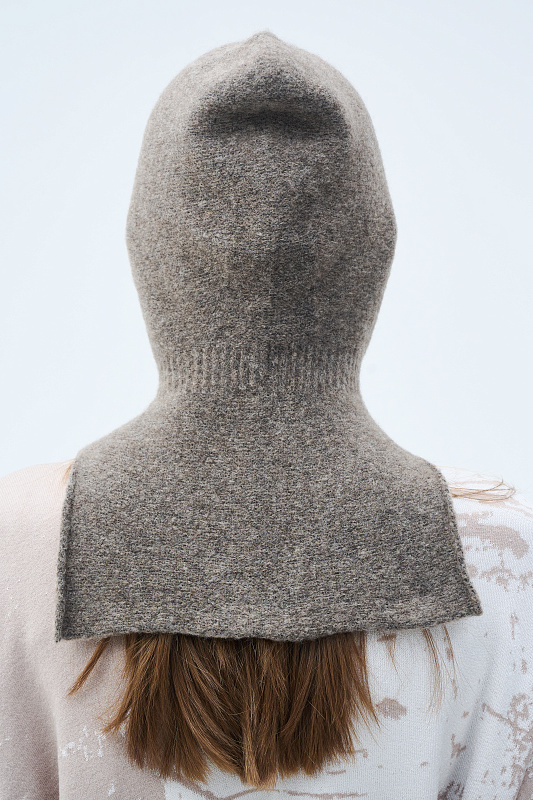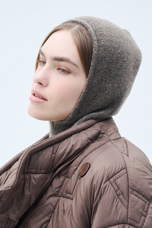 Цельновязаный капор с воротником - манишкой – выполнен из буклированной пряжи в составе с ценной и мягкой шерстью Яка, переплетением с ластичным элементом по линии шеи.