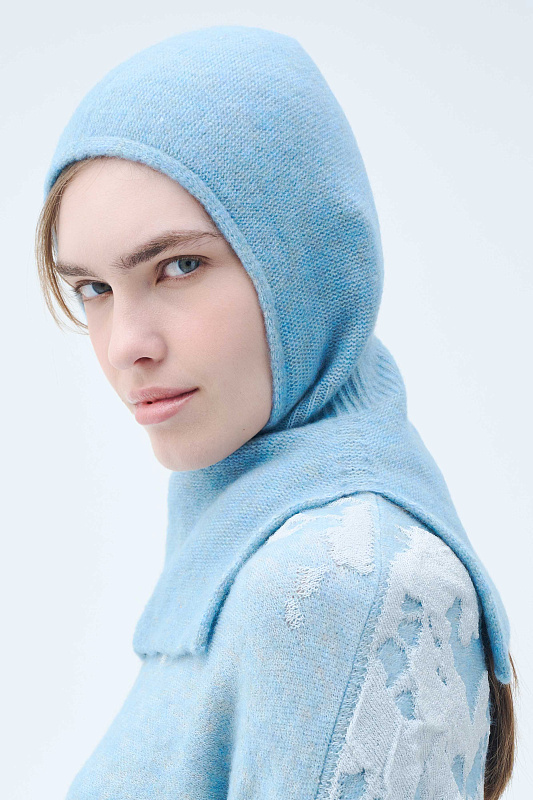 Цельновязаный капор с воротником - манишкой – выполнен из буклированной пряжи в составе с ценной и мягкой шерстью Яка, переплетением с ластичным элементом по линии шеи.
