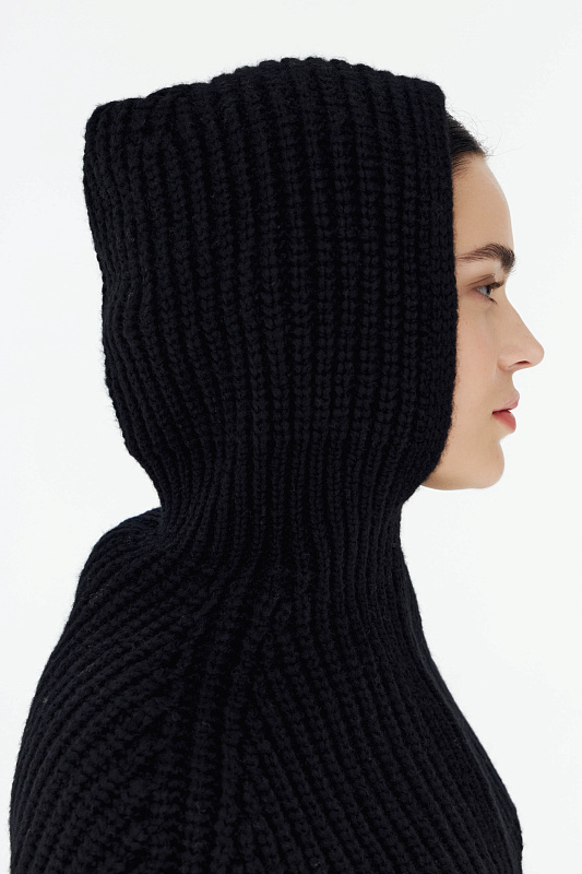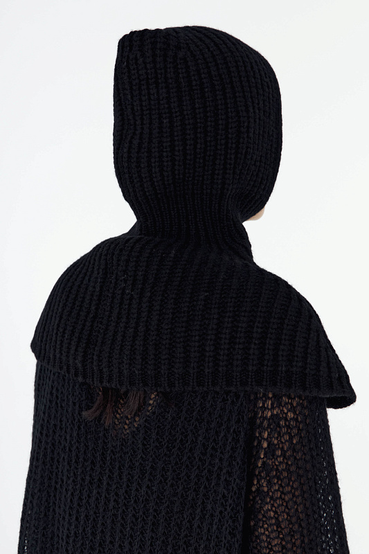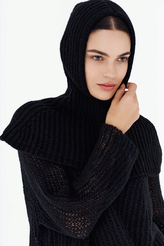 Цельновязаный капор с воротником- манишкой –из пряжи нежнейшей шерсти бэби альпаки и тонкой шерсти мериноса, выполнена объемным переплетением в сочетании с ластичным элементом по линии шеи.