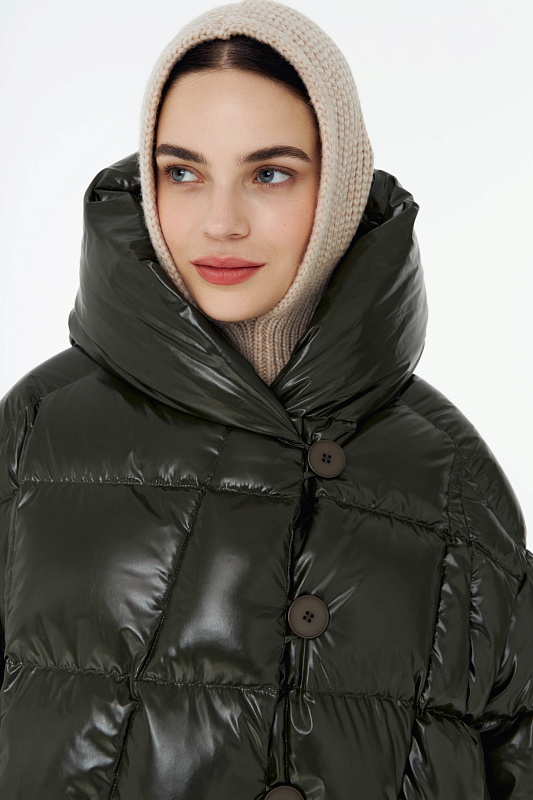 Цельновязаный капор с воротником- манишкой –из пряжи нежнейшей шерсти бэби альпаки и тонкой шерсти мериноса, выполнена объемным переплетением в сочетании с ластичным элементом по линии шеи.