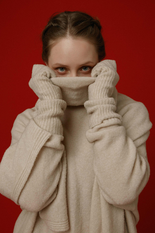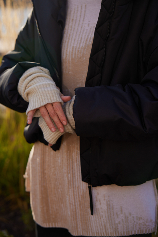 Цельновязанные митенки из тонкой буклированной пряжи. Выполнены ластичным переплетением. Теплый и уютный аксессуар, придающий образу завершенность или акцент.