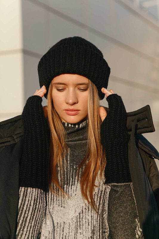 Цельновязанные митенки из пряжи нежнейшей шерсти бэби альпаки и тонкой шерсти мериноса,  выполненные ластичным переплетением. Теплый и уютный аксессуар, придающий образу завершенность или акцент.