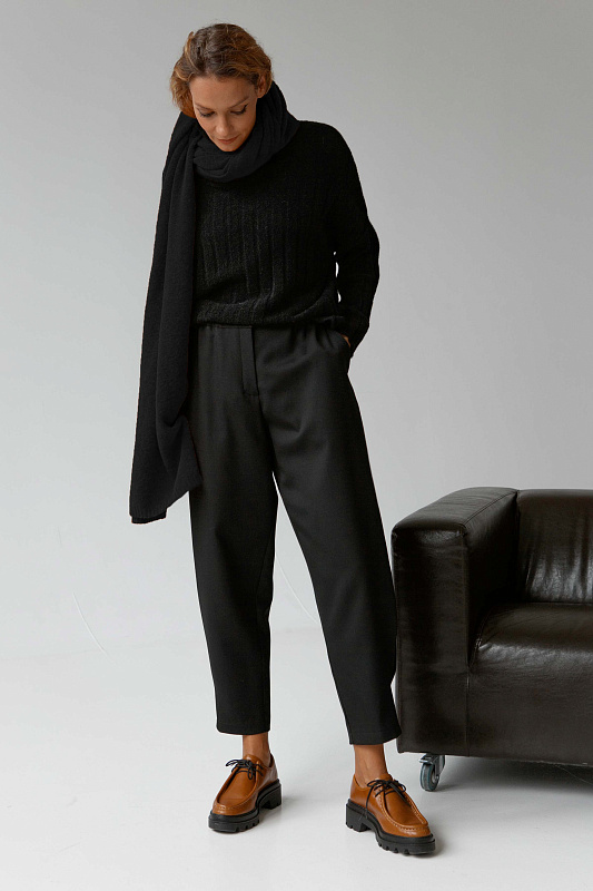 Широкий шарф-палантин из тонкой буклированной пряжи. Выполнен лицевой кулирной гладью. Теплый и уютный аксессуар, придающий образу завершенность.