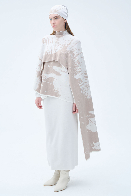 Вязаный гладкий шарф-палантин. Выполнен на контрасте матовой текстуры вискозы с кашемиром и глянцевой вискозы жаккардовым переплетением в виде графического рисунка.
