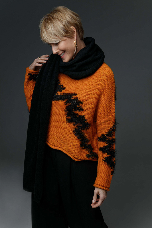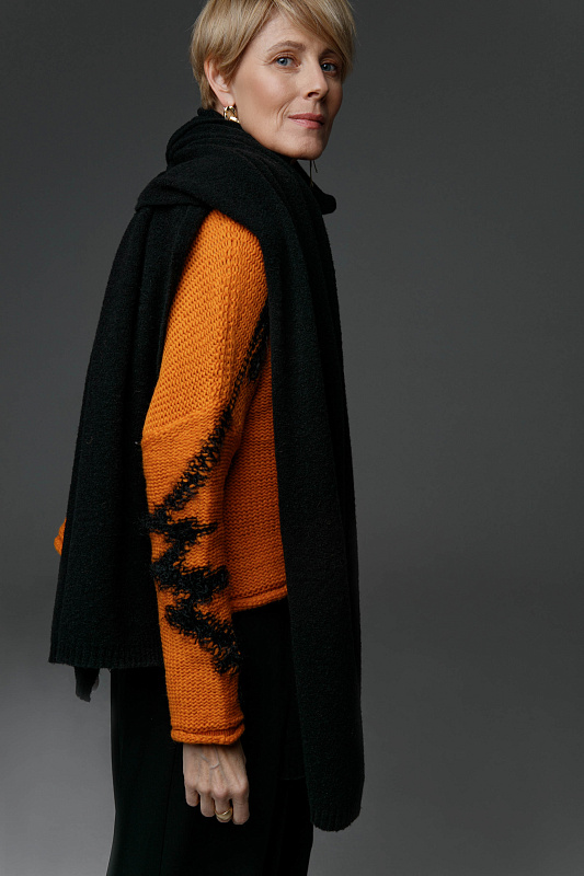 Широкий и уютный шарф-палантин из тонкой буклированной пряжи. Выполнен лицевой кулирной гладью.