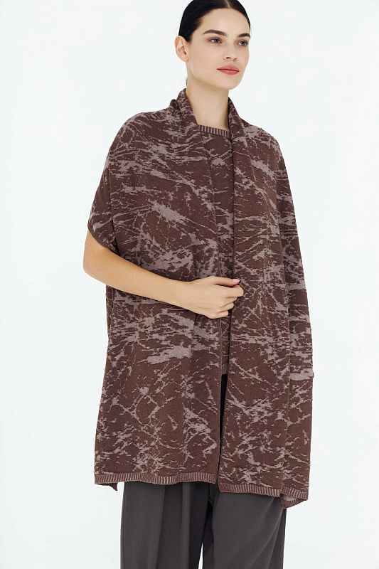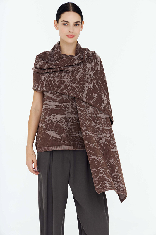 Вязаный палантин из тонкого полотна с вывязанным фактурным контрастным рисунком с «жатым» эффектом. Выполнен из нежной вискозы с кашемиром.