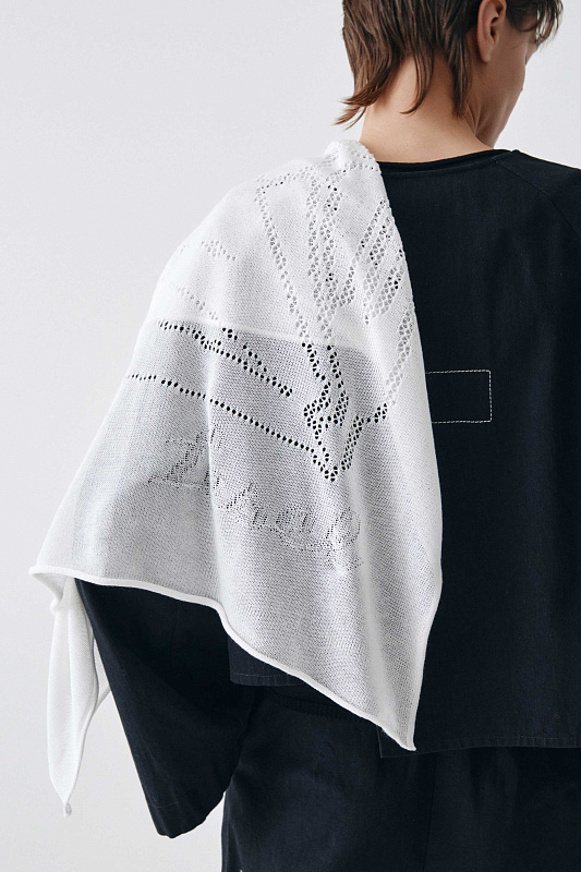 Вязаный платок с ажурным графическим рисунком. Выполнен из полупрозрачного тонкого струящегося полотна с мерцающим блеском.