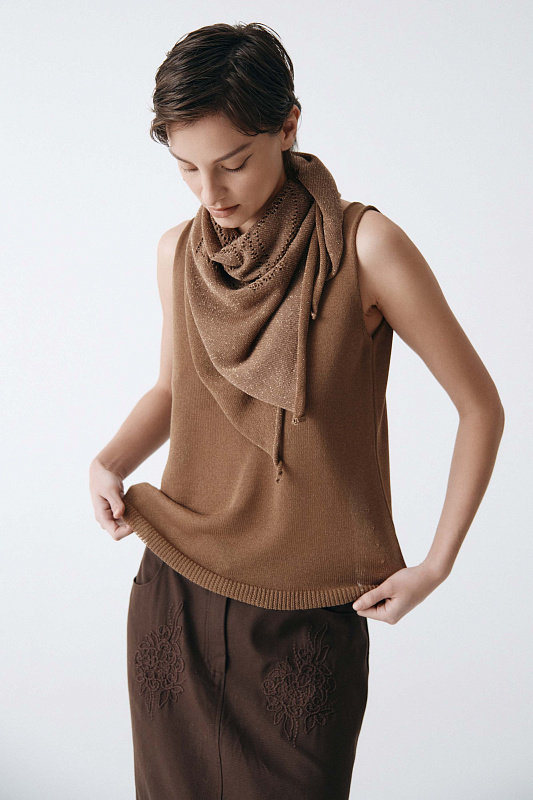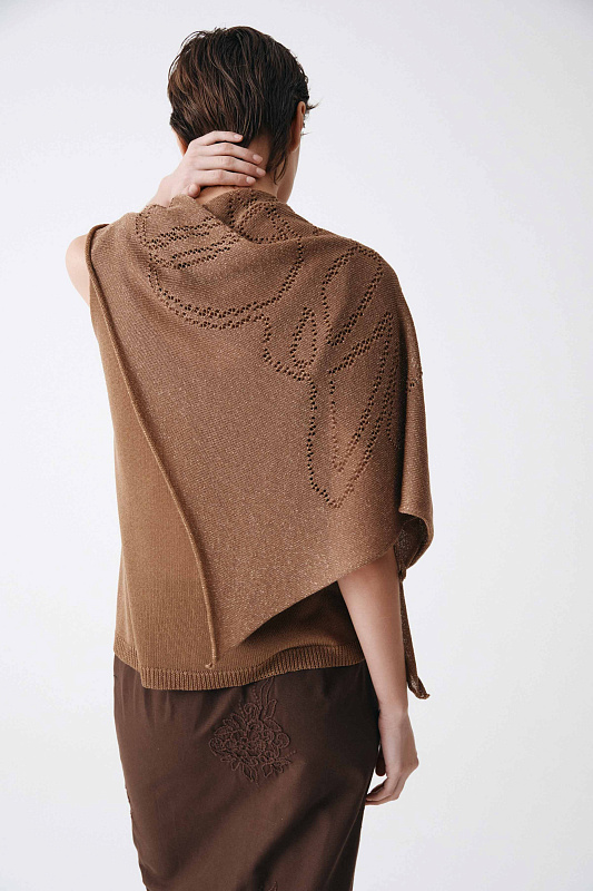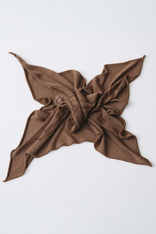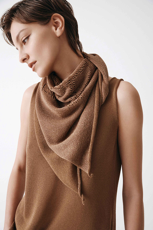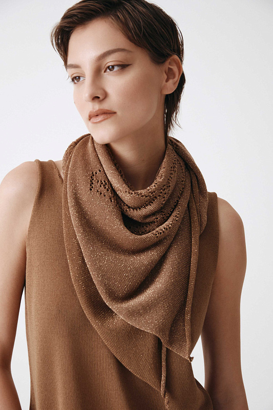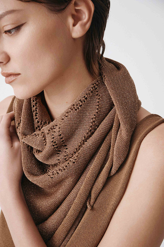 Вязаный платок с ажурным графическим рисунком. Выполнен из полупрозрачного тонкого струящегося полотна с мерцающим блеском.