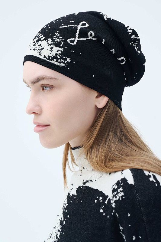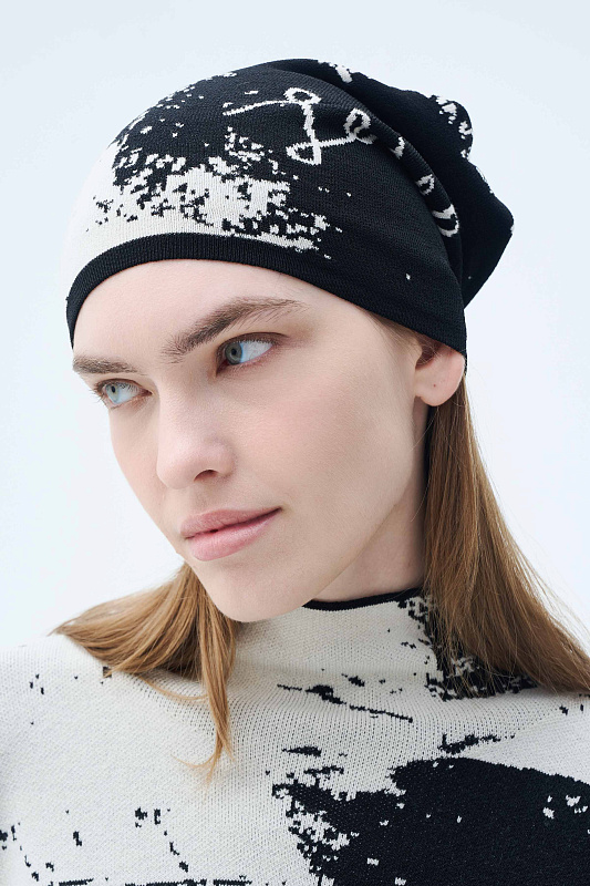 Вязаная гладкая шапка. Выполнена на контрасте матовой текстуры вискозы с кашемиром и глянцевой вискозы жаккардовым переплетением в виде графического рисунка.