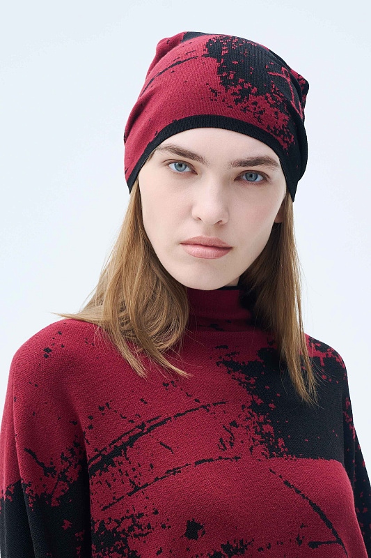 Вязаная гладкая шапка. Выполнена на контрасте матовой текстуры вискозы с кашемиром и глянцевой вискозы жаккардовым переплетением в виде графического рисунка.