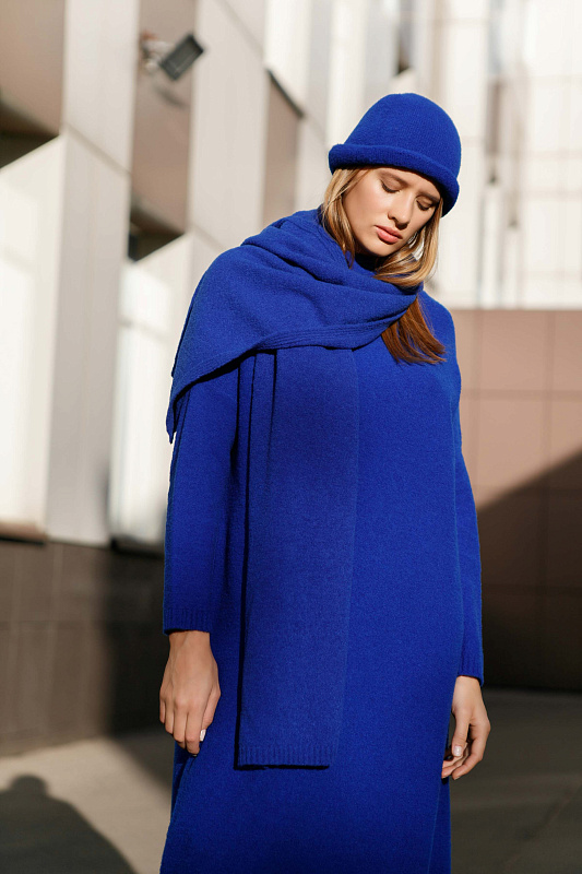 Плотная теплая цельновязанная шапка с руликом по краю изделия. Выполнена из тонкой буклированной пряжи лицевой кулирной гладью. Без дополнительного объема.
