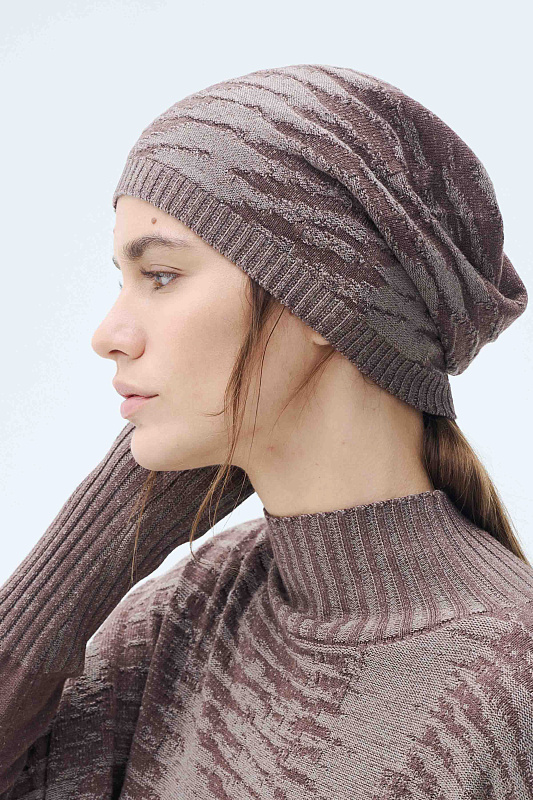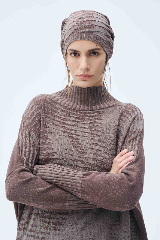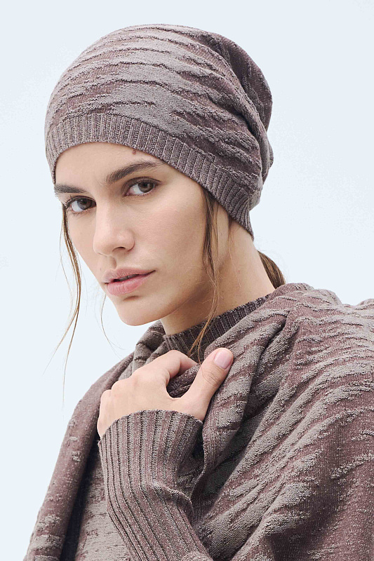 Вязаная шапка из нежной  вискозы с кашемиром.  Выполнена переплетением с абстрактным рисунком. Тонкое полотно делает изделие тактильно приятным.