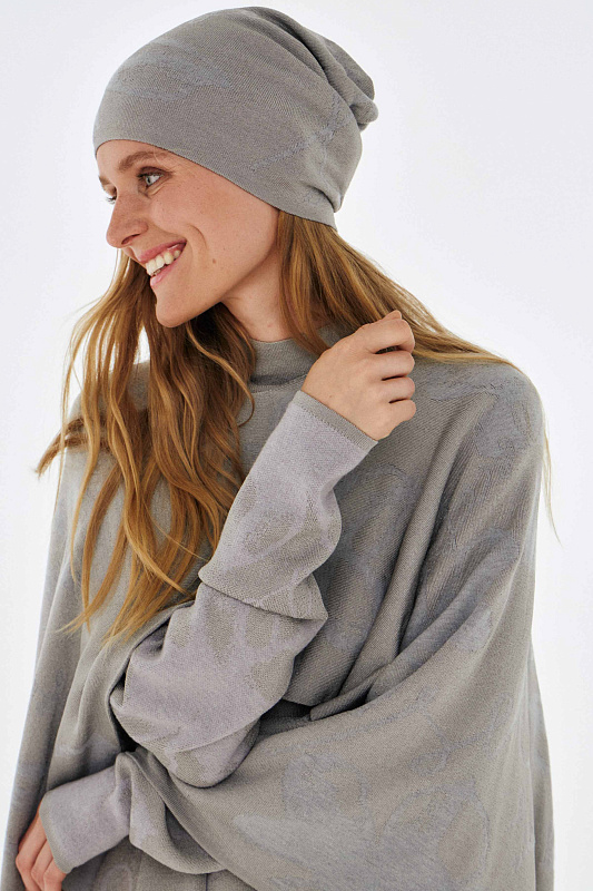 Вязаная гладкая шапка. Выполнена на контрасте матовой текстуры вискозы с кашемиром и глянцевой вискозы жаккардовым переплетением в виде графических цветочных мотивов с надписями.