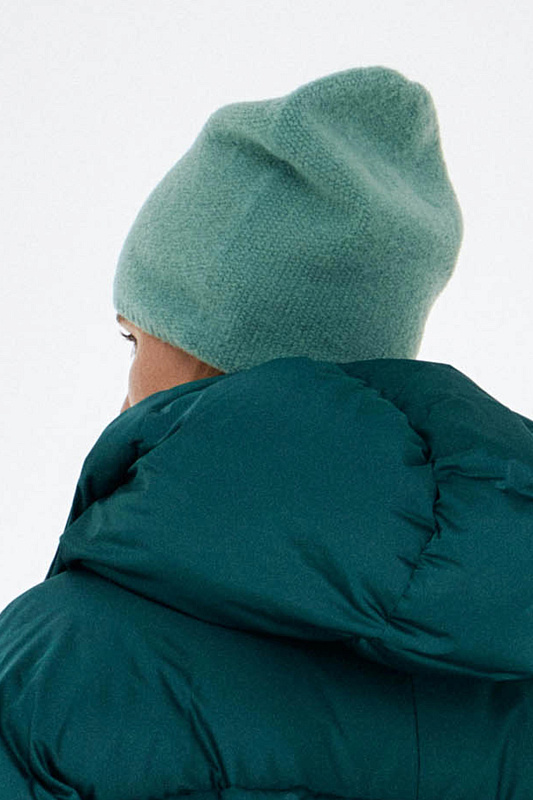Цельновязаная шапка из буклированной пряжи силуэта «овал».  В этом аксессуаре мягкий и воздушный эффект пряжи раскрывается за счет переплетения.