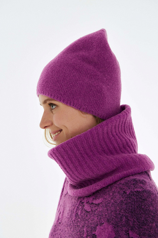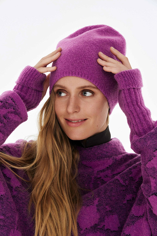 Цельновязаная шапка из буклированной пряжи силуэта «овал».  В этом аксессуаре мягкий и воздушный эффект пряжи раскрывается за счет переплетения.