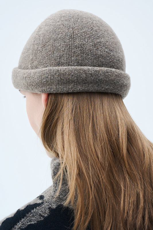 Цельновязаная шапка из буклированной пряжи в составе с ценной и мягкой шерстью Яка силуэта «овал».  В этом аксессуаре мягкий и воздушный эффект пряжи раскрывается за счет переплетения.