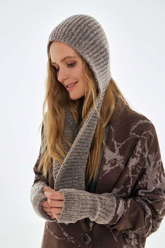 Цельновязанная шапка с ушками из буклированной пряжи  тонкой шерсти мериноса,  выполненная ластичным переплетением.