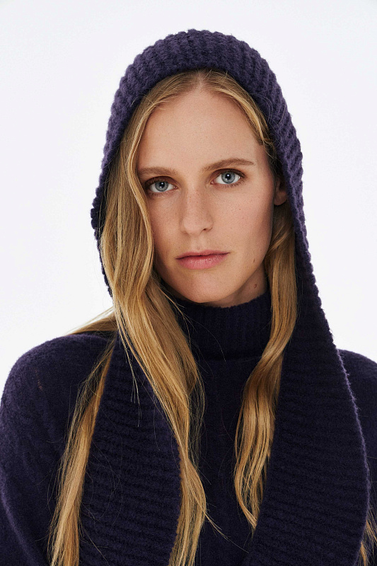 Цельновязанная шапка с ушками из буклированной пряжи  тонкой шерсти мериноса,  выполненная ластичным переплетением.