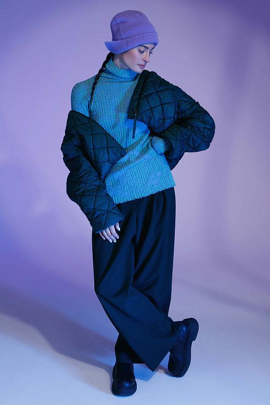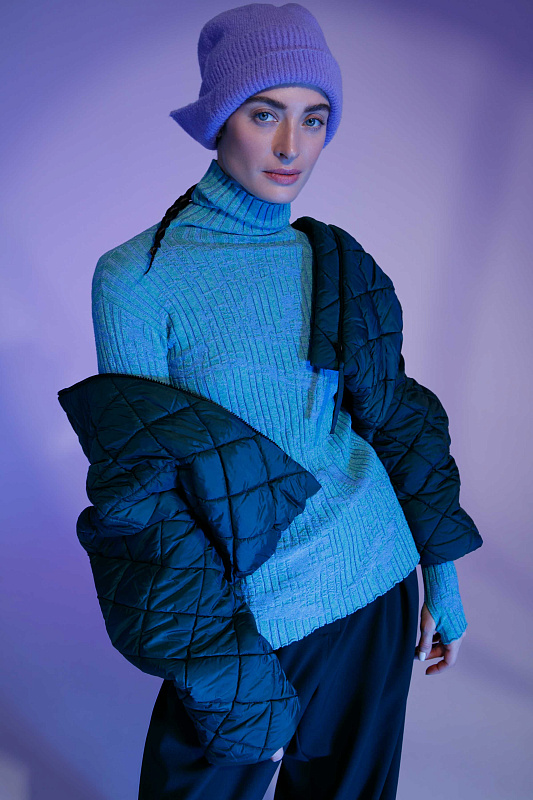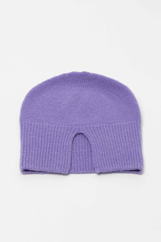 Элегантная мягкая теплая цельновязанная шапка из тонкой буклированной пряжи с разрезом.