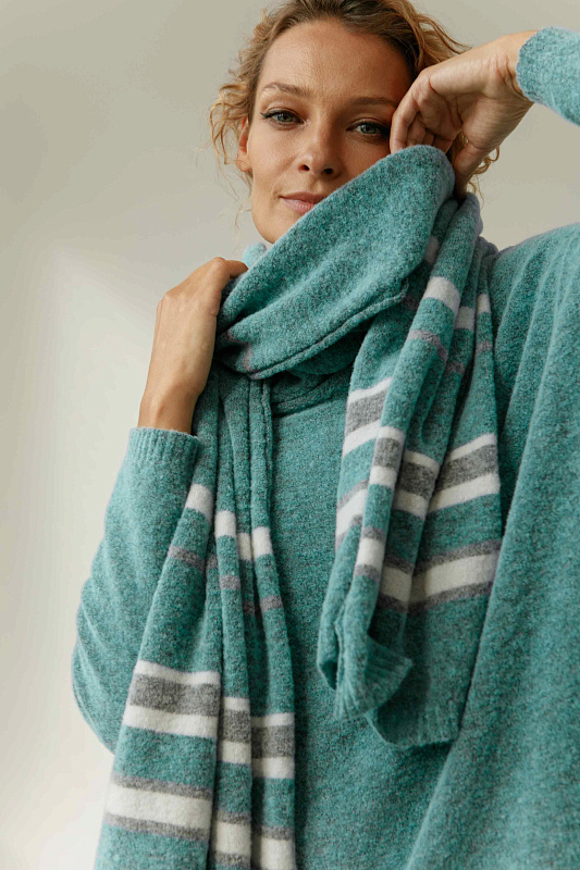 Широкий шарф-палантин из тонкой буклированной шерсти. Теплый и уютный аксессуар, придающий образу завершенность. Шарф выполнен кулирной гладью.