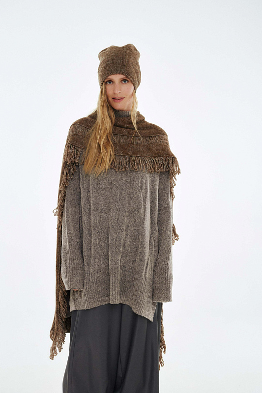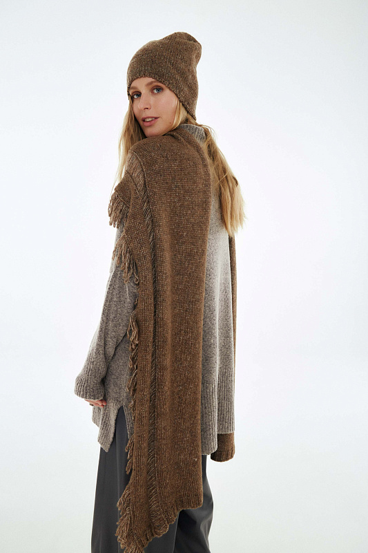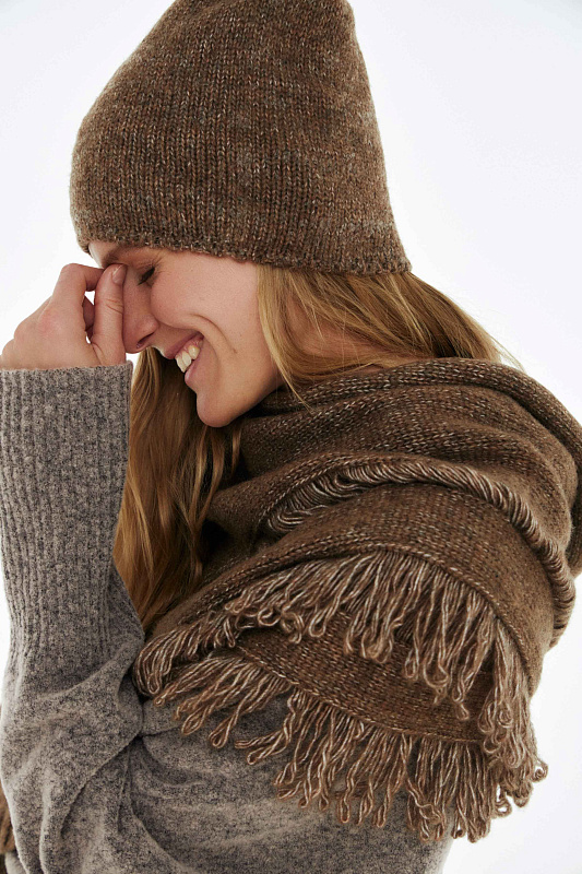 Вязаный шарф c характерной меланжевой текстурой с очень нежной и пушистой поверхностью. Пряжа придает комфортное ощущение мягкости  –  идеальное решение для холодного времени года. Бахрома и протяжки завершают модель неформальным акцентом.