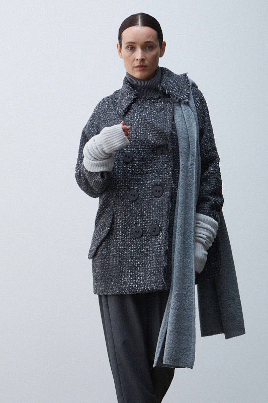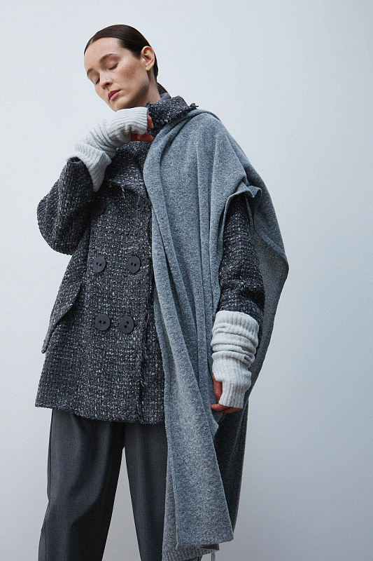 Широкий шарф-палантин из тонкой буклированной шерсти. Выполнен лицевой кулирной гладью. Теплый и уютный аксессуар, придающий образу завершенность.