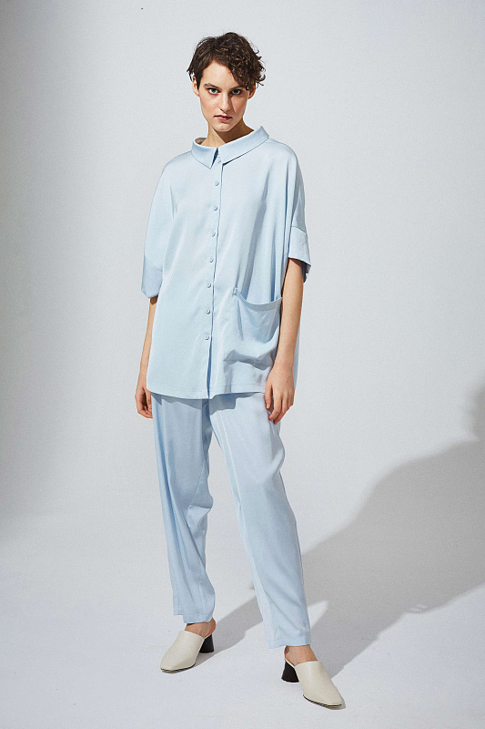 Блуза на потайной застежке с асимметричным воротником, с кокеткой и складками по спинке. Изделие выполнено из нежной шелковистой вискозы.