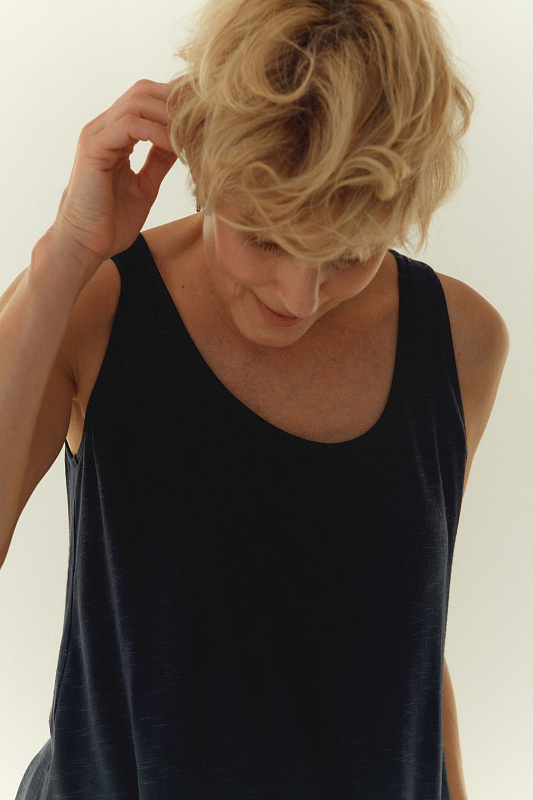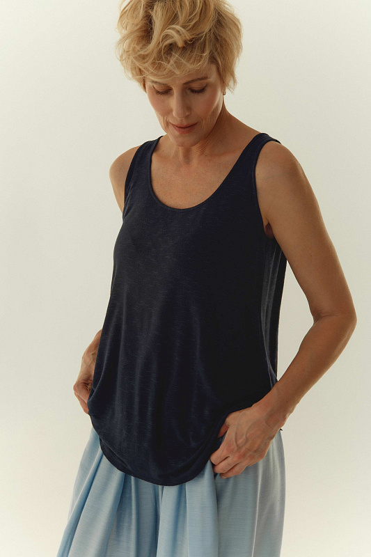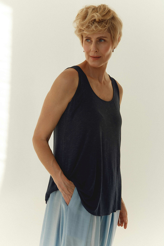 Базовый топ А-силуэта без рукавов, с круглым вырезом горловины. Выполнен из мягкой и нежной вискозы с небольшим содержанием эластана, что делает эту модель очень комфортной в носке. В коллекции присутствует во всех цветах сезона.