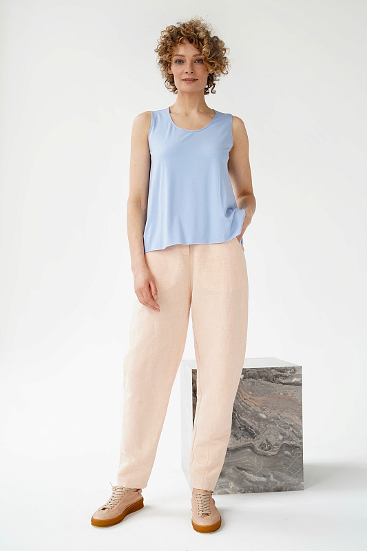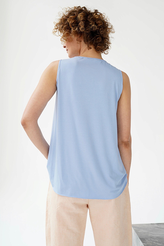 Базовый топ А- силуэта без рукавов, с круглым вырезом горловины. Выполнен из мягкой вискозы с добавлением эластана. Прекрасный вариант для создания базового гардероба.
