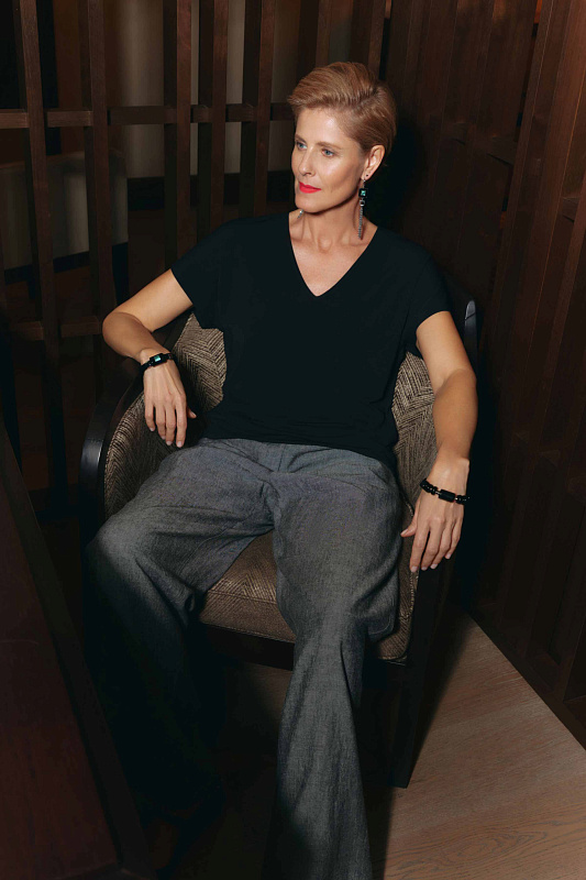 Базовая блуза с коротким цельнокроеным рукавом и с V-образным вырезом выполнена из тонкого эластичного трикотажа. Блуза станет основой для создания любого образа.
