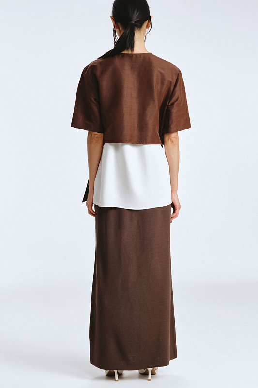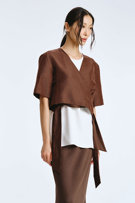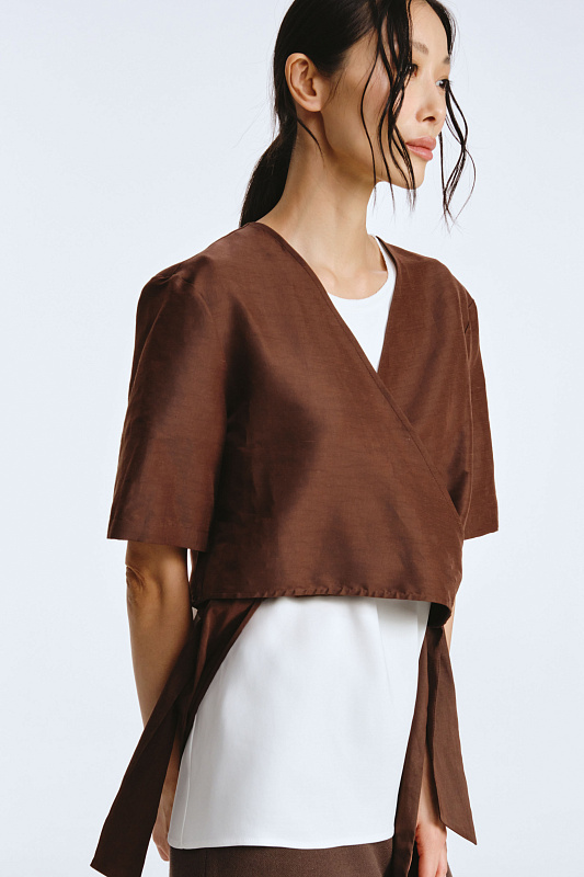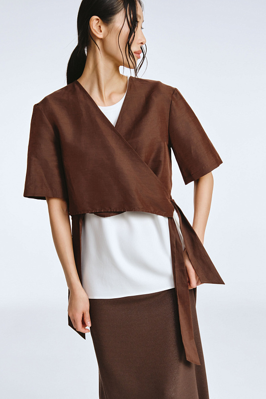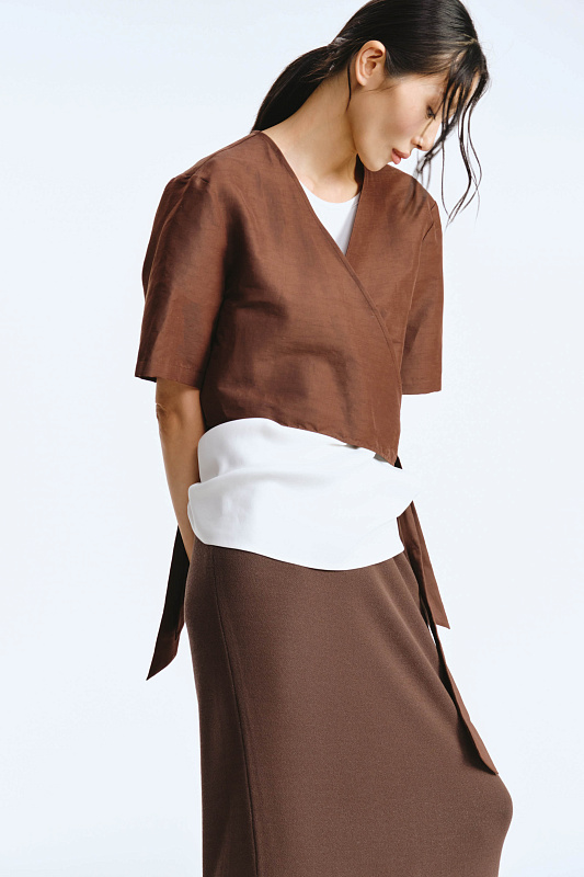Болеро — это элегантный и стильный укороченный жакет длиной до талии, который привлекает внимание своим лаконичным дизайном и изысканными деталями. Болеро часто украшают разнообразными элементами декора. Наши дизайнеры внесли в крой нотку загадочности и шарма. Широкие завязки служат не только украшением, но и функциональным элементом. Они являются гармоничным завершением, выполняя функцию пояса. Завязки могут быть зафиксированы с боков, спереди и сзади, а также могут свободно ниспадать, что позволяет акцентировать внимание на деталях. Нахлест ткани при фиксации завязок образует очень женственный V-образный вырез. Сочетание льна и хлопка в одной ткани создает материал, который объединяет в себе лучшие свойства обоих волокон. 2% эластана — для комфортной, правильной посадки изделия.