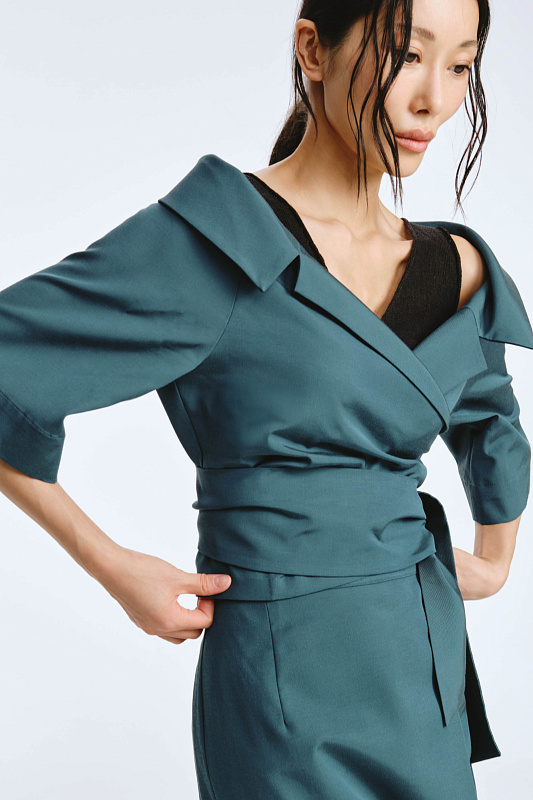 Модель укороченного жакета длиной до талии и комфортной длиной рукава. Жакет без застежки. Лаконичным завершением болеро служат завязки, выполняя функцию пояса — аксессуар, вплетенный в дизайн. Меняйте форму, плотность узлов, длину свободных концов — вы получите новый образ за секунды. Запах образует глубокий вырез, эффектно подчеркивает линию шеи. Открытая зона декольте добавляет ноту чувственности, сохраняя при этом утонченную скромность. Болеро — ключ к стилю для тех, кто ценит смелые акценты и не боится выделяться.