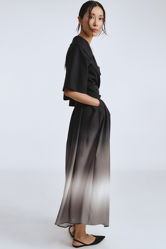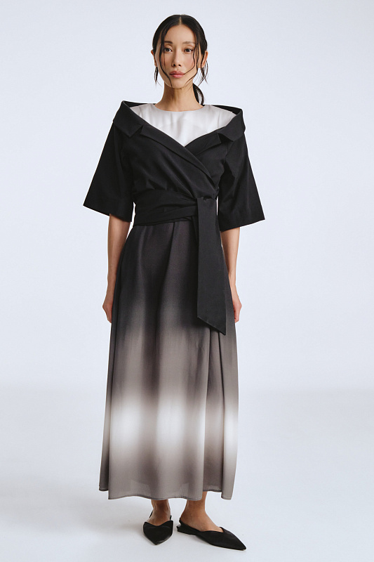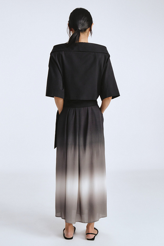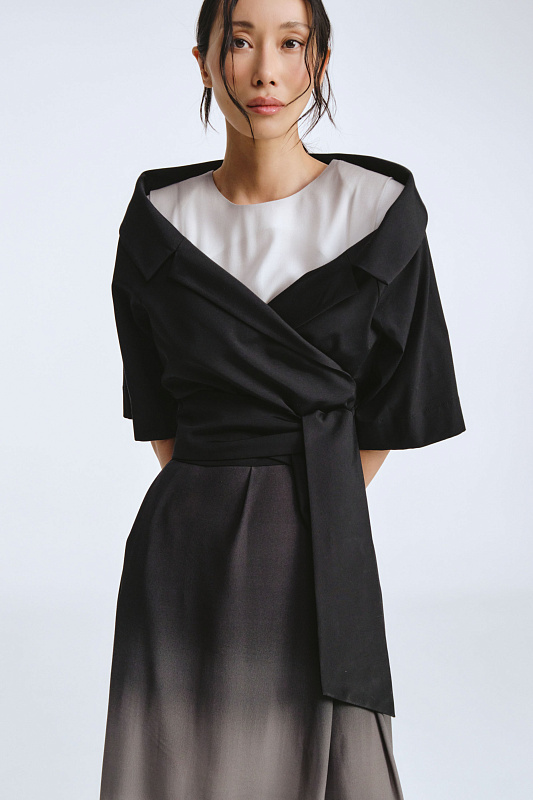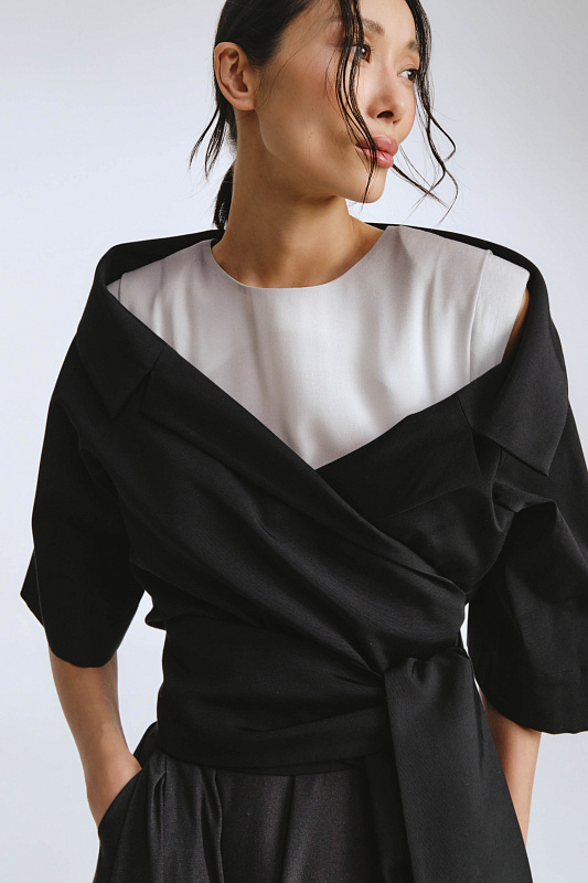 Модель укороченного жакета длиной до талии и комфортной длиной рукава. Жакет без застежки. Лаконичным завершением болеро служат завязки, выполняя функцию пояса — аксессуар, вплетенный в дизайн. Меняйте форму, плотность узлов, длину свободных концов — вы получите новый образ за секунды. Запах образует глубокий вырез, эффектно подчеркивает линию шеи. Открытая зона декольте добавляет ноту чувственности, сохраняя при этом утонченную скромность. Болеро — ключ к стилю для тех, кто ценит смелые акценты и не боится выделяться.