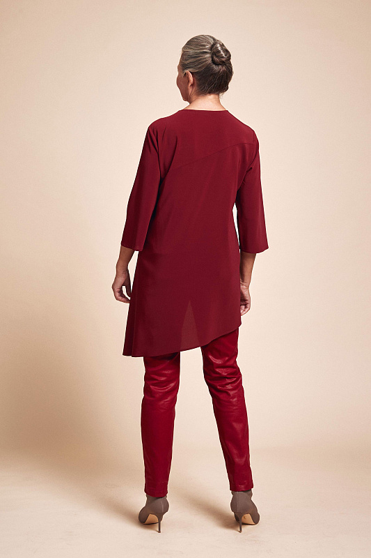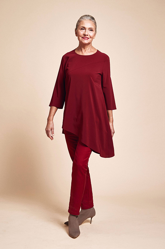 Блуза с разрезом в боковом шве, рукав ¾, круглый вырез горловины. Оригинальный, слегка расклешенный силуэт с асимметричной линией низа, выполненной по диагонали. Ткань нежная и струящаяся вискоза.