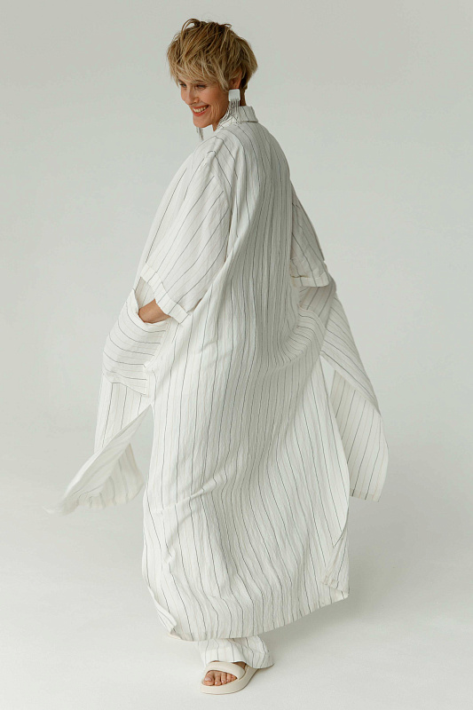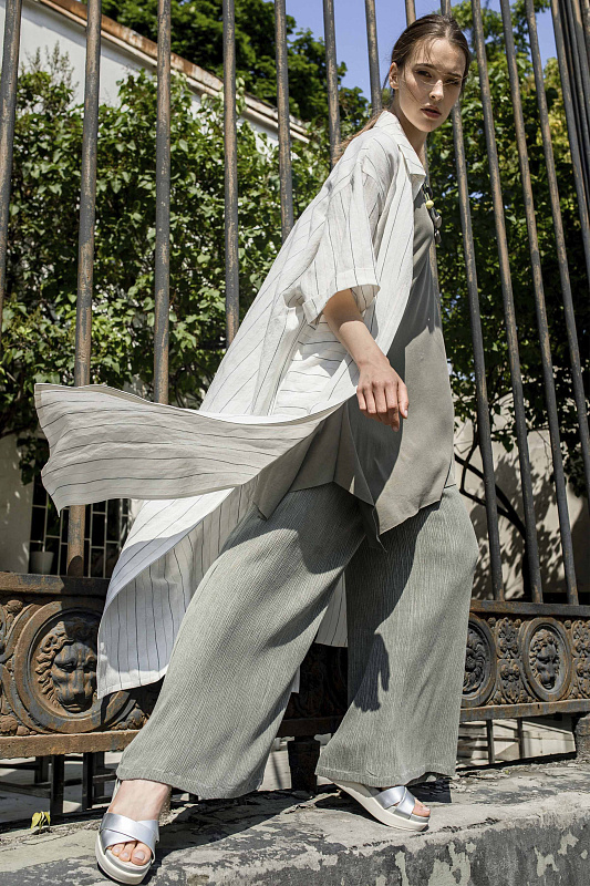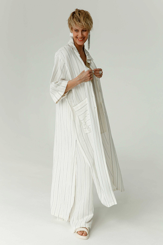 Длинная льняная блуза на пуговицах, прямой силуэт, короткий рукав, удлиненная спинка, большие накладные карманы, глубокие боковые разрезы.