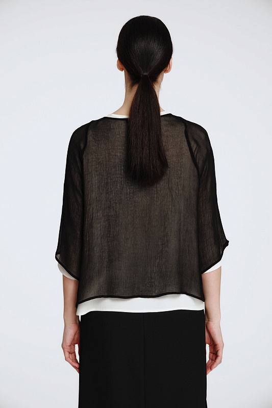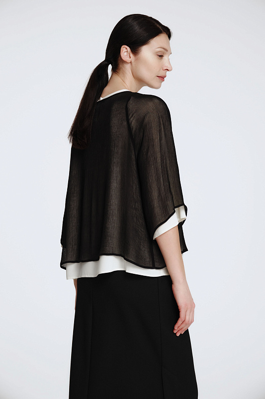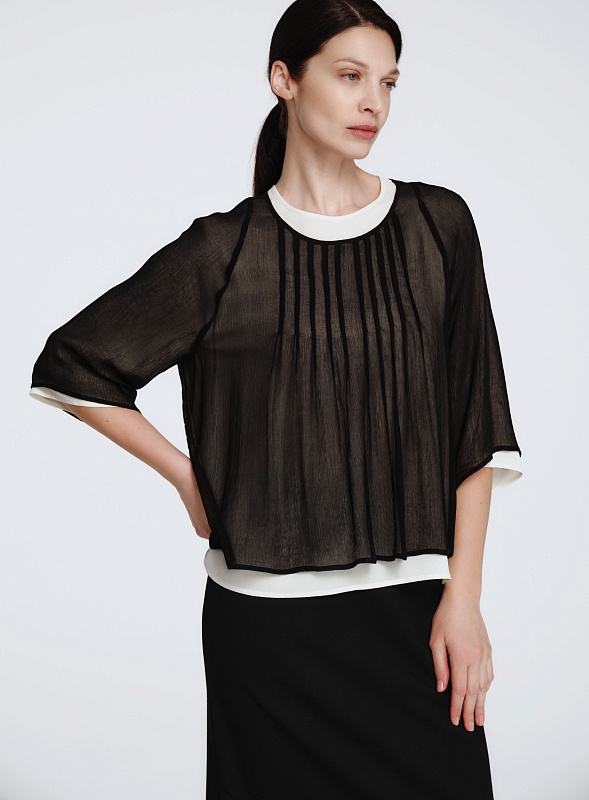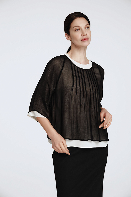 Многослойность — это эффектный стилистический приём, который позволяет создавать яркие и неординарные образы, умело расставляя акценты. Чтобы подчеркнуть красоту верхней блузы, дизайнеры добавили нижний контрастный слой. Благодаря этому рельефные отделочные швы — защипы по округлой горловине блузы — стали более яркими и выразительными. Особую оригинальность блузе придаёт рукав реглан, который идеально дополняет её фасон. Он мягко и плавно переходит от линии плеч, создавая гармоничное завершение образа. Такие дизайнерские решения делают это изделие поистине уникальным.