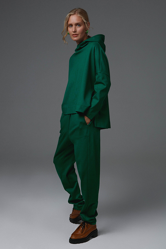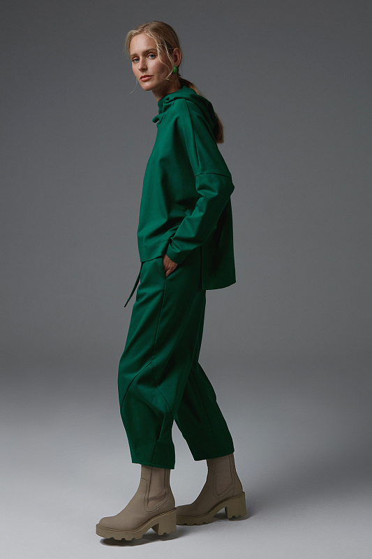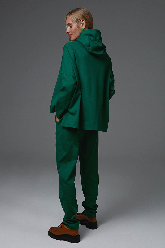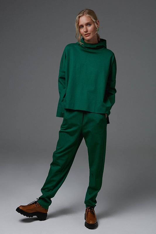 Трендовая блуза с компактным капюшоном стиля спорт-шик из плотного эластичного джерси. Модель прямого силуэта с боковыми разрезами и чуть удлиненной спинкой.
