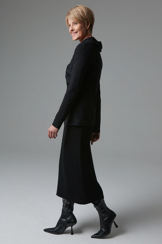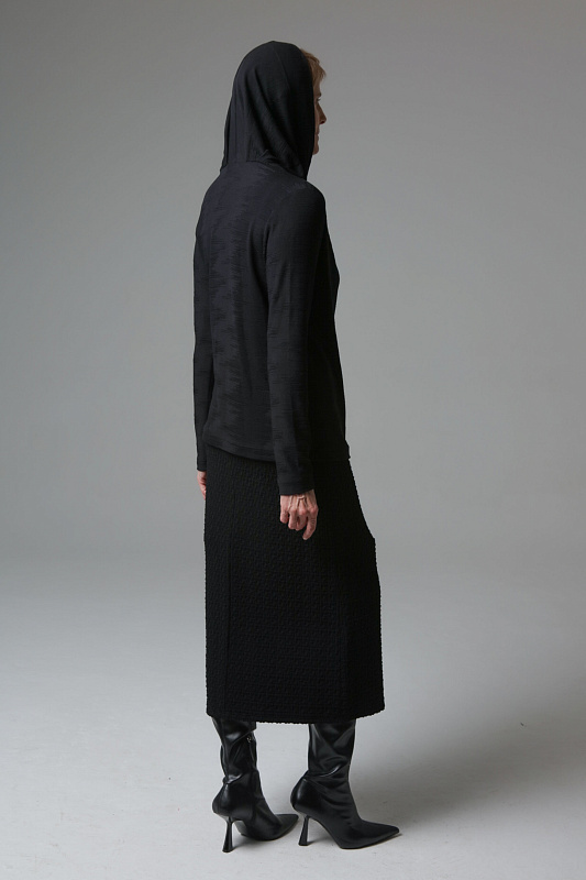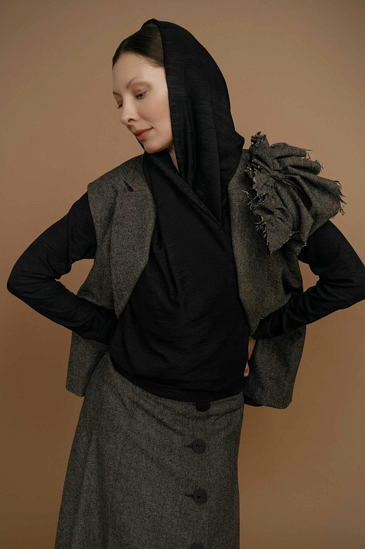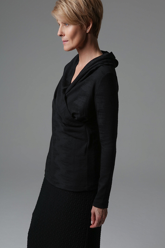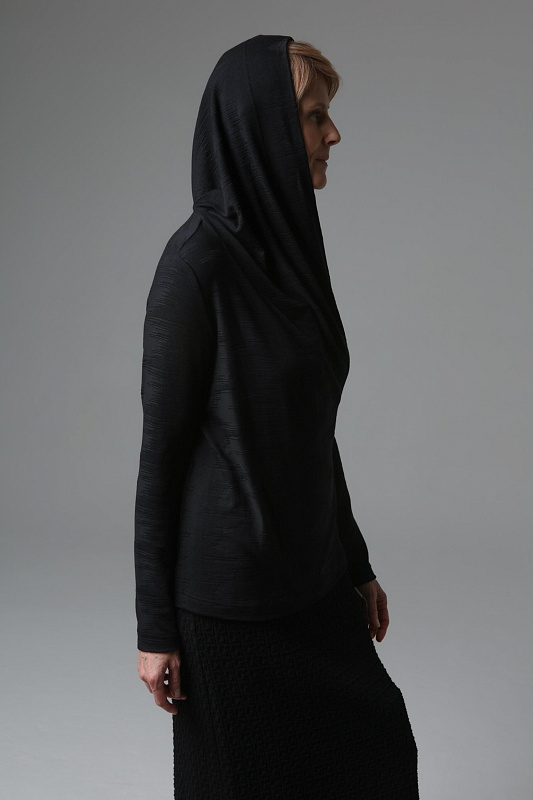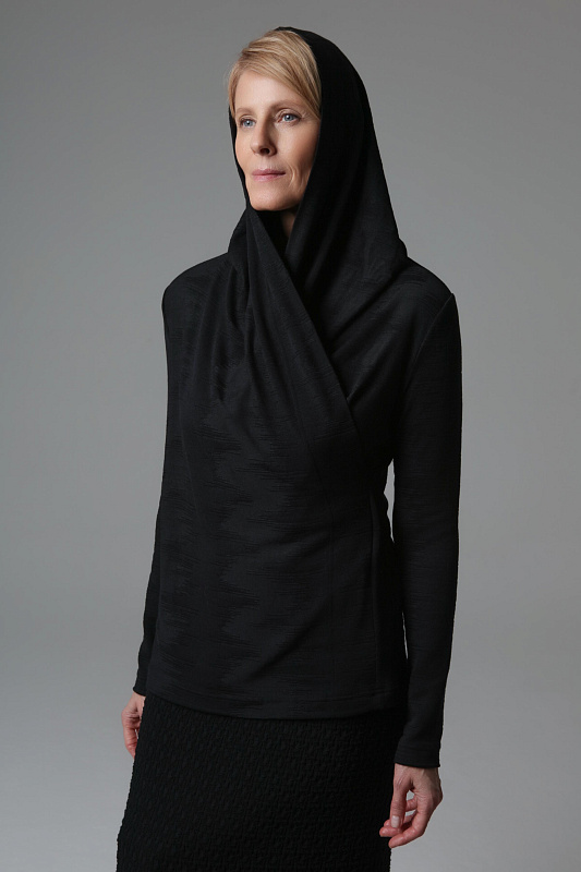 Креативная блуза из вискозы с добавлением эластана имеет неординарную конструкцию и текстуру. Ткань достаточно плотная и одновременно дышащая, обволакивающая и очень пластичная, приятная к телу. Оригинальная конструкция формирует V-образный вырез с запАхом, переходящим в капюшон, фиксируется мягкой внутренней деталью в области талии. Что гарантирует надежное прилегание при любых активностях. Носим в комплекте с жилетами или как самостоятельную модель.