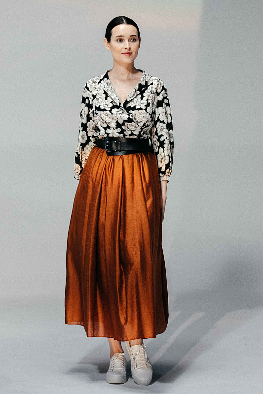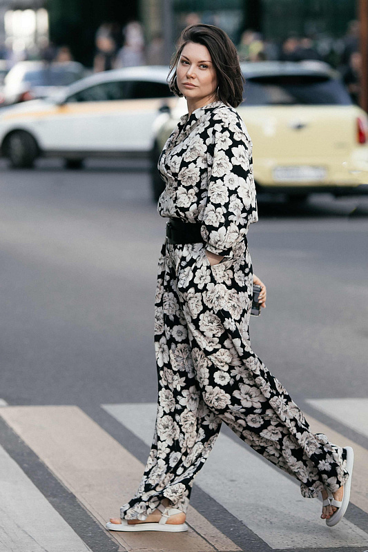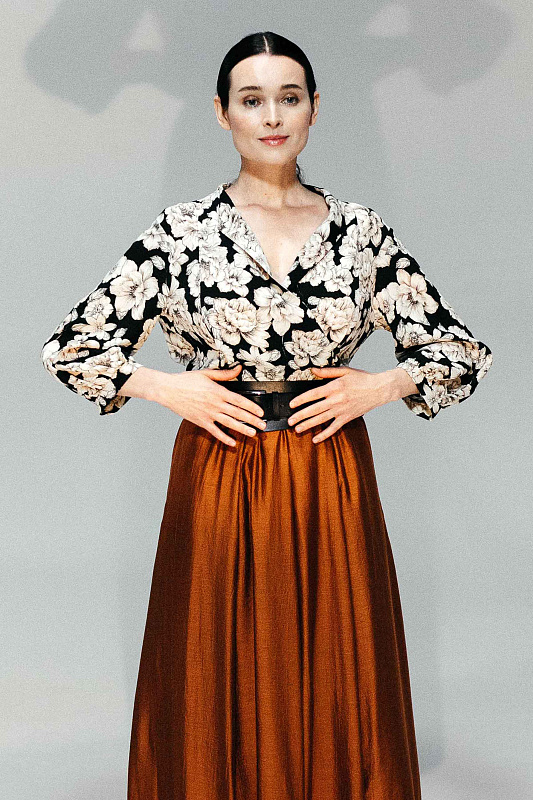 Вискозная блуза с оригинальным цветочным принтом с рукавами-буфами. Застежка на маленькие пуговицы, внутри на завязке. Спинка на кокетке.