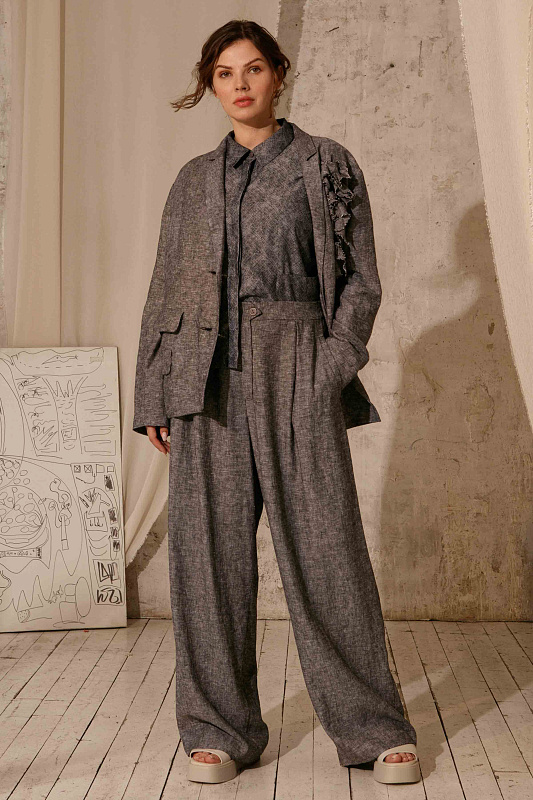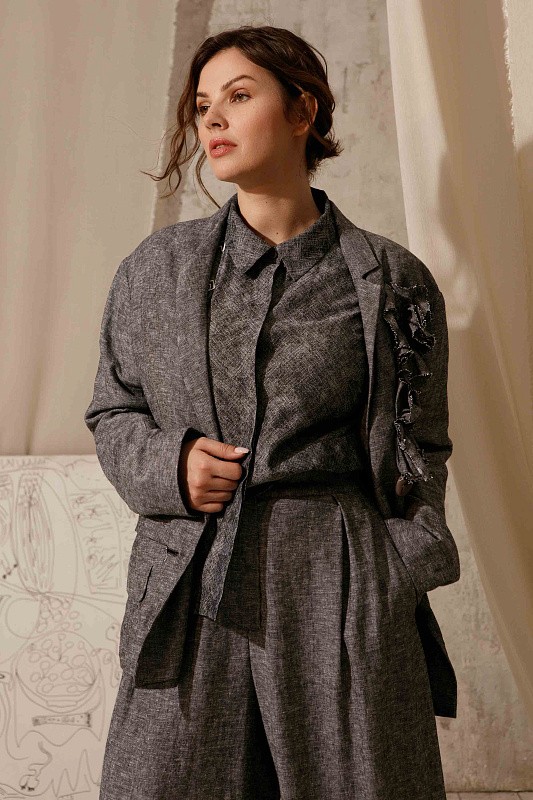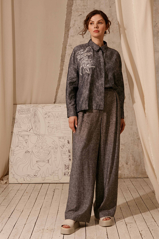 Оригинальная хлопокая блуза силуэта квадрат с авторской вышивкой. Спущенная линия плеча, свободный крой, накладной карман на полочке, рубашечный вырез горловины, длинные рукава на манжетах с пуговицами.