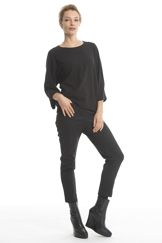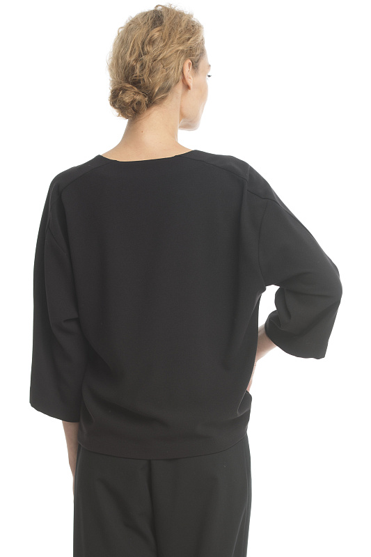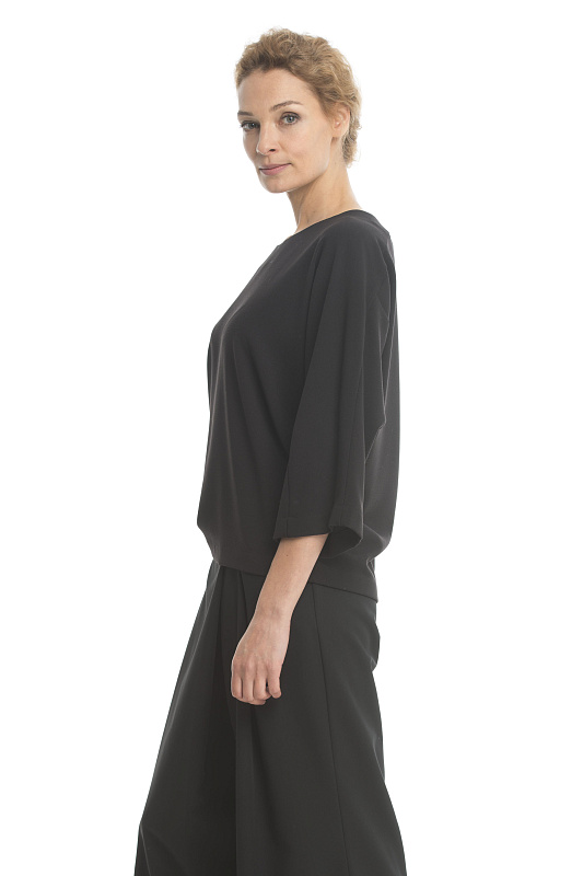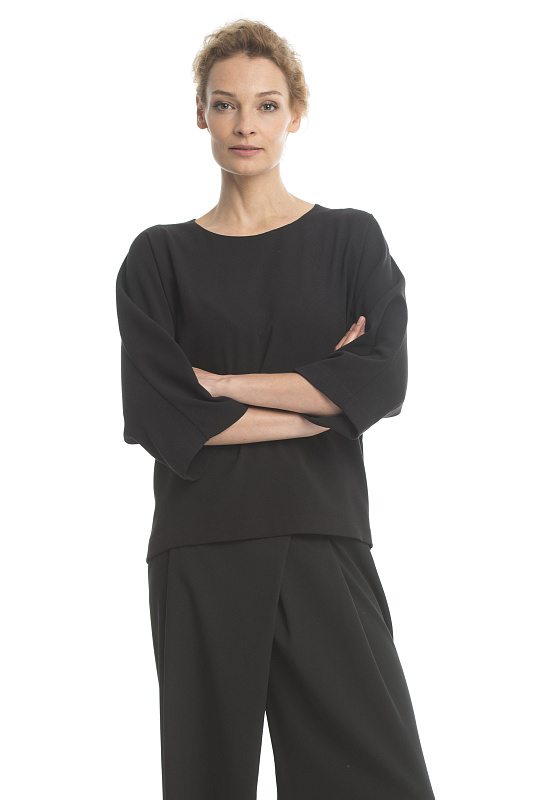 Блуза минималистского покроя из вискозной ткани. Модель с округлой горловиной, без застёжки. Длина рукава до запястья. Прекрасная вещь для базового гардероба.