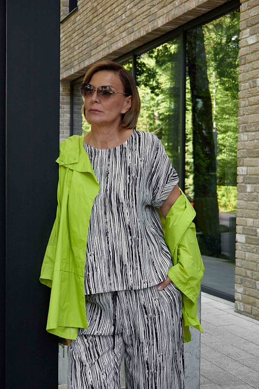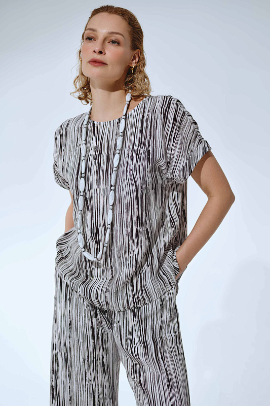 Вискозная блуза сводобного кроя с нерегулярным рисунком в виде вертикальных неравномерных штрихов. Круглая горловина, целькроенный рукав с отворотом..