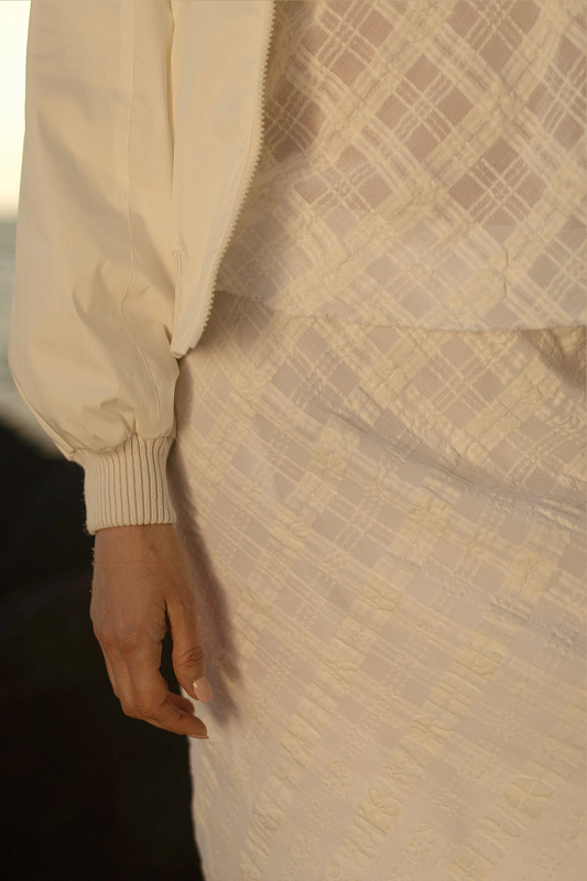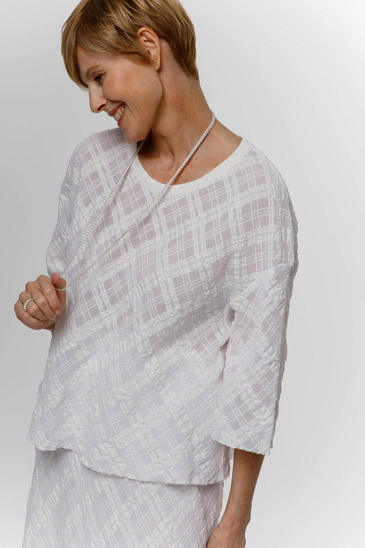 Чуть спущенная линия плеча делает образ романтичным, а жаткая полупрозрачная клета подчеркивает оригинальную фактуру ткани. Горловина блузы выполнена с небольшим вискозным подвязом. Концепта этой блузе добавляют необработанные края по рукавам и низу.