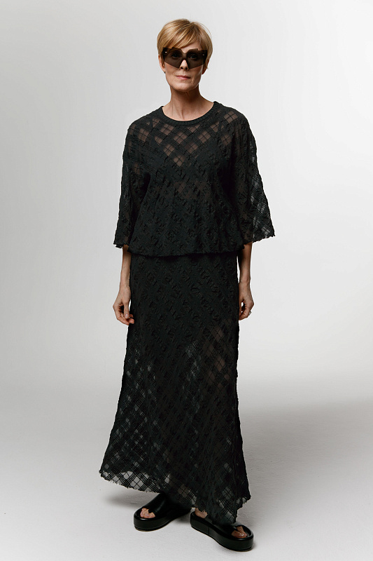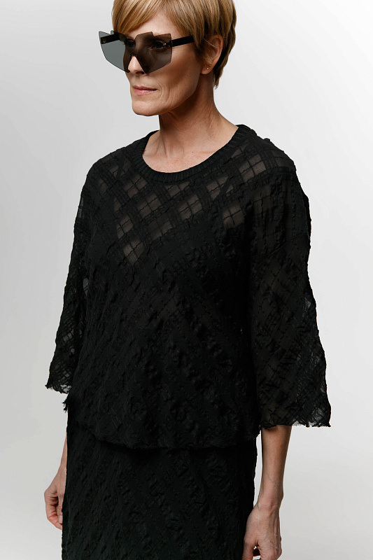 Чуть спущенная линия плеча делает образ романтичным, а жаткая полупрозрачная клета подчеркивает оригинальную фактуру ткани. Горловина блузы выполнена с небольшим вискозным подвязом. Концепта этой блузе добавляют необработанные края по рукавам и низу.