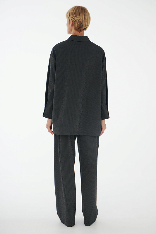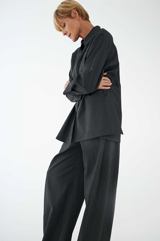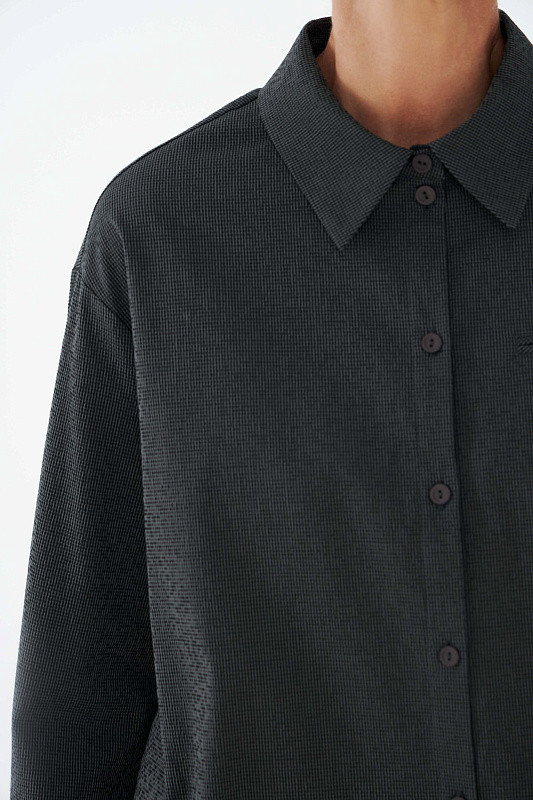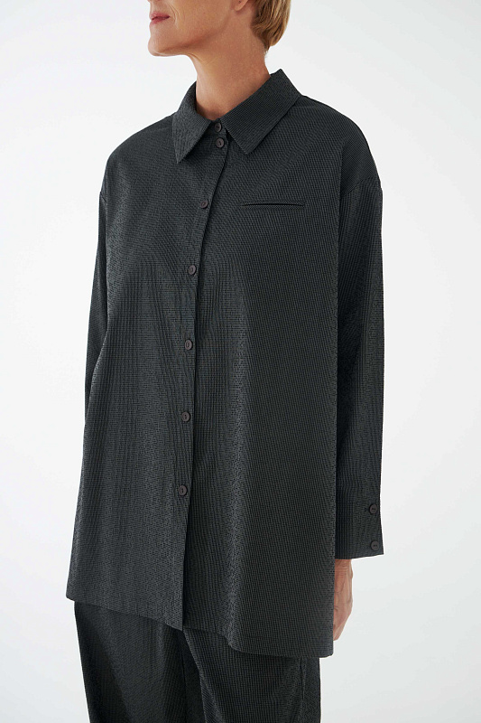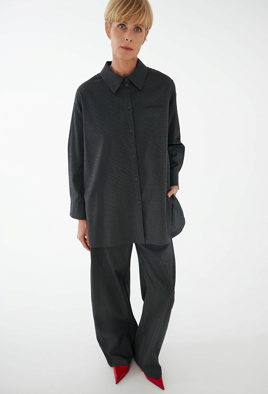 Блуза силуэта квадрат в мелкую клетку Виши выполнена из плотного фактурного хлопка с добалением эластана. Рубашечный воротник на стойке, застежка на маленькие пуговицы, по бокам блузы деликатные разрезы. На левой полочке декоративный карман. Для создания эффектного городского образа стилизуем блузу с брюками из одноименной капсулы.