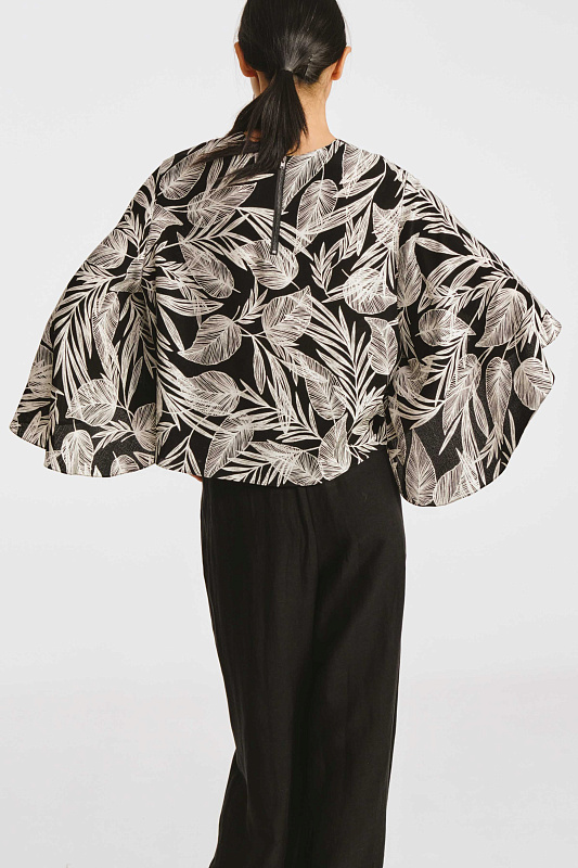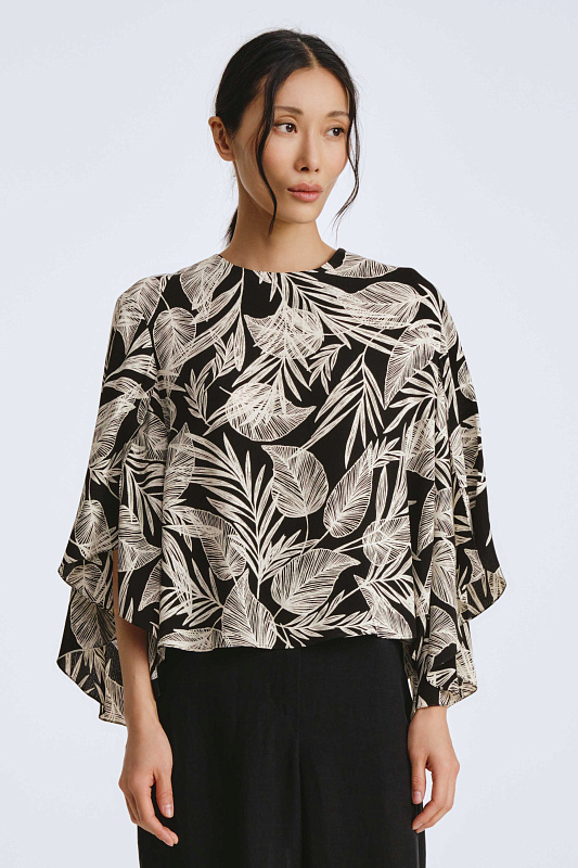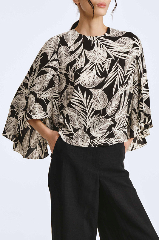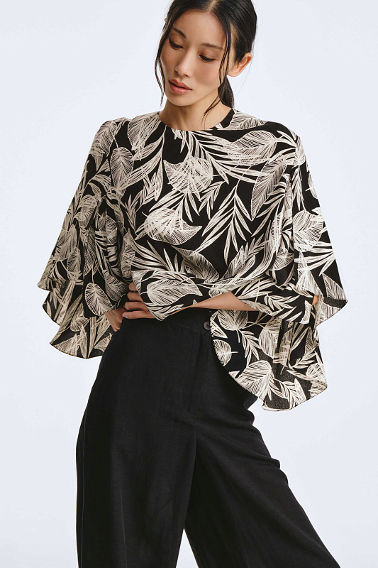 Блуза свободного кроя с необычным дизайном рукавов, которые создают воздушный и легкий образ. Немного расклешенный к низу рукав, незастроченный с внутренней стороны, словно крыло бабочки, дарит ощущение парения. Неглубокий V-образный вырез удлиняет линию шеи и гармонично сочетается с различными аксессуарами. Ткань, в составе которой вискоза, идеально драпируется, добавляя легкости. Украшением блузы служит принт «листья» — свежий летний тренд экостиля и натуральных мотивов.