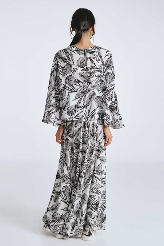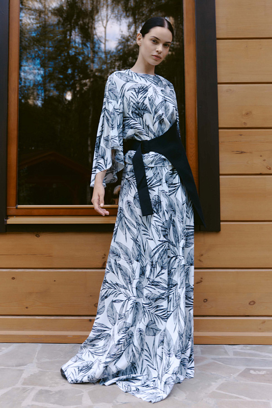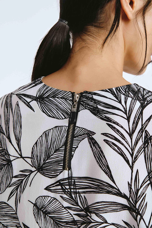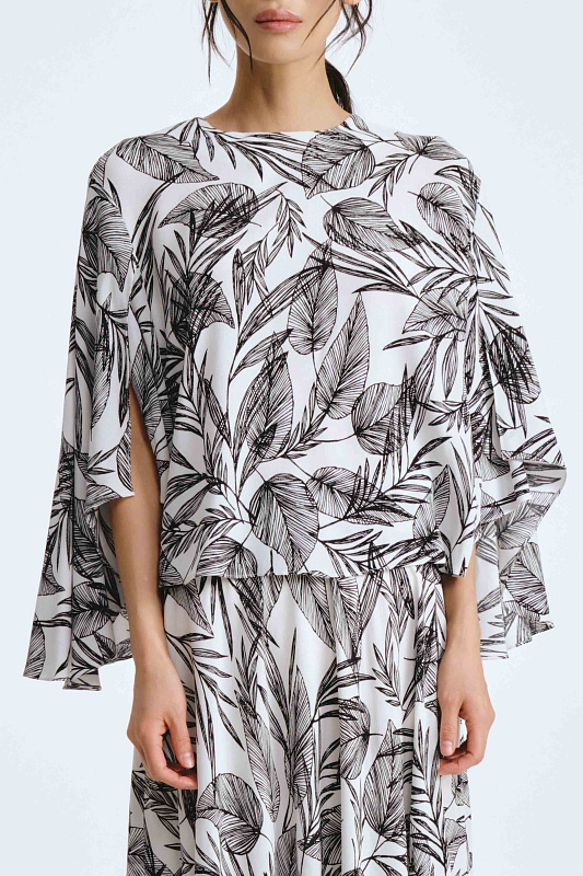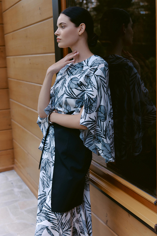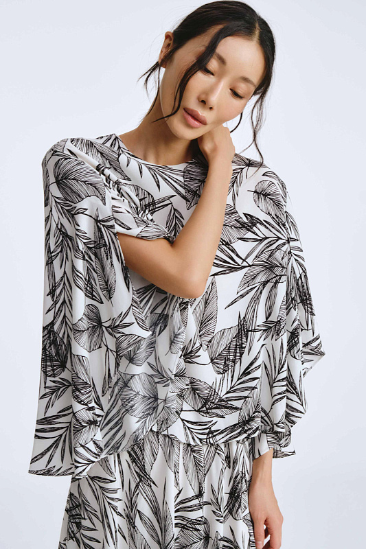 Блуза свободного кроя с необычным дизайном рукавов, которые создают воздушный и легкий образ. Немного расклешенный к низу рукав, незастроченный с внутренней стороны, словно крыло бабочки, дарит ощущение парения. Неглубокий V-образный вырез удлиняет линию шеи и гармонично сочетается с различными аксессуарами. Ткань, в составе которой вискоза, идеально драпируется, добавляя легкости. Украшением блузы служит принт «листья» — свежий летний тренд экостиля и натуральных мотивов.