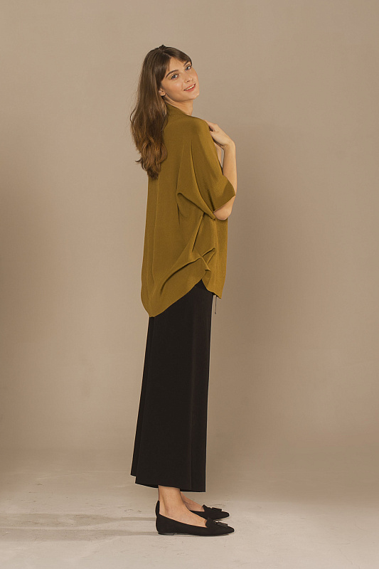 Блуза свободного силуэта-кимоно с оригинальной конструкцией выреза горловины лодочка-конверт со смещенным плечевым швом. Не обработанный край рукава и низа изделия. Суперсовременная плотная, струящаяся ткань микро-гофре. Длина по спинке 78см.