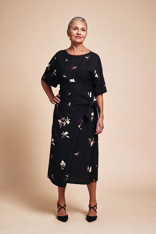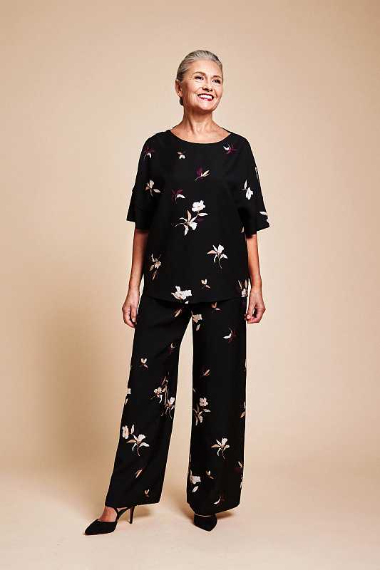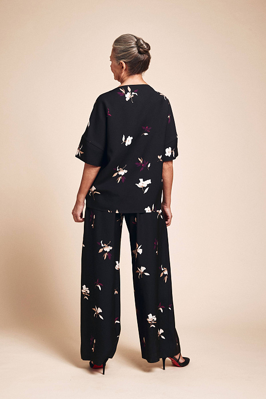 Блуза прямого силуэта с круглым вырезом горловины, спущенная линия плеча. Модель выполнена из плотной и нежной вискозы.